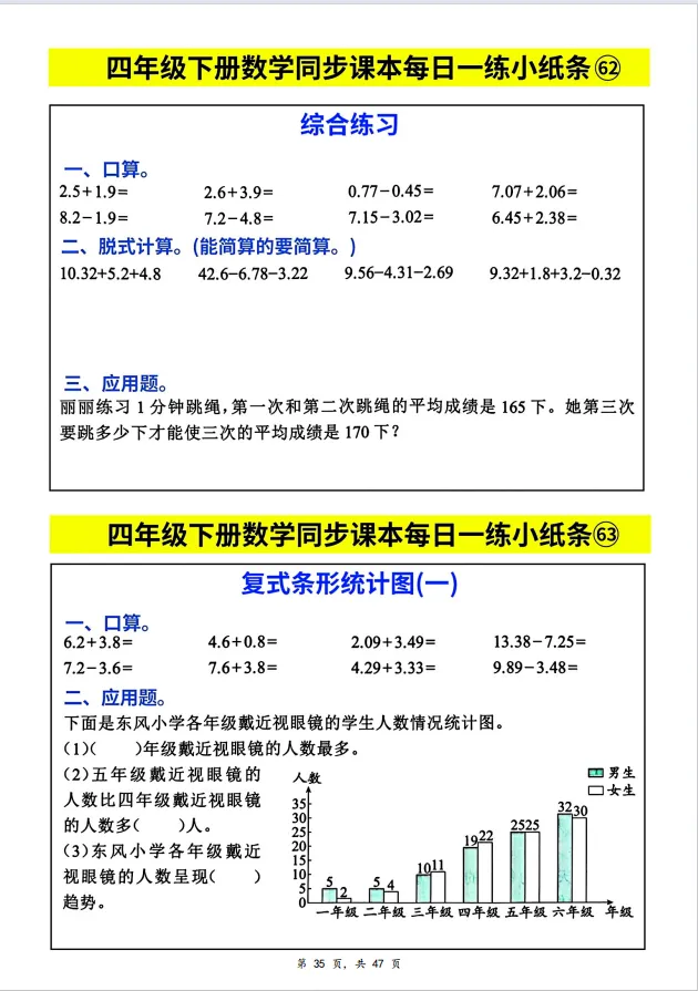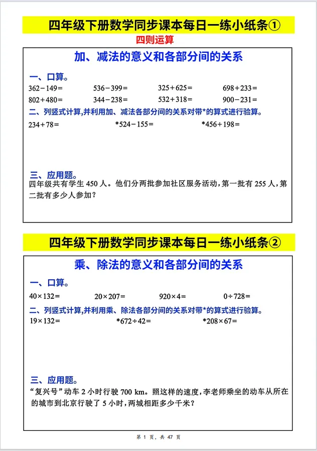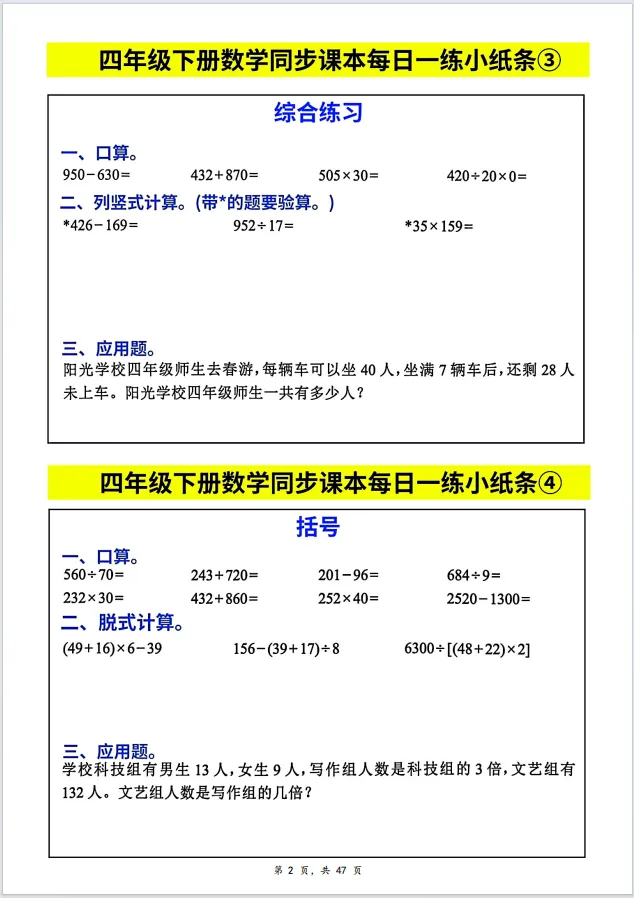 2026春人教版小学四年级下册数学同步课本每日一练小纸条(含答案47页)