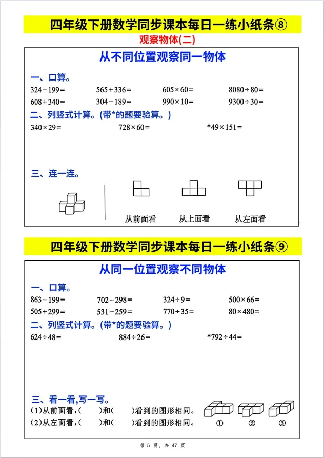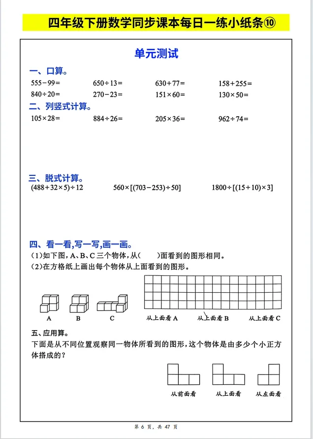 2026春人教版小学四年级下册数学同步课本每日一练小纸条(含答案47页),专为人教版四年级下册孩子量身打造,严格对标2026春人教版四年级下册数学课本,同步每节课时进度,以“同步课本、每日1练、小纸条便捷、含答案易复盘”为核心,47页科学排版、重点突出,兼顾基础巩固与适度提升,自带详细答案方便自查自纠,既是孩子课后同步练习、自主纠错的专属工具,也是家长辅导、老师课堂辅助练习的优质资料,帮助四年级孩子夯实数学基础、规范答题格式、提升解题能力,养成每日练、及时改的良好学习习惯。