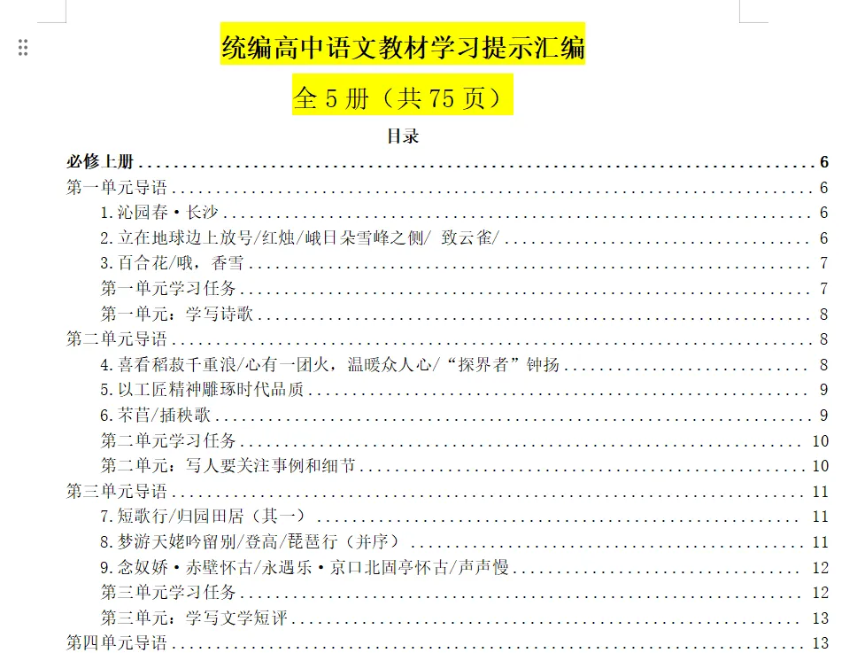 之前发过的一个学习提示汇编的word版,很多朋友说过期了,这里再分享一下哈,这个备课的时候还是很好用的呢~~通过网盘分享的文件:学年统编版高中语文全5册每课学习提示汇编.docx