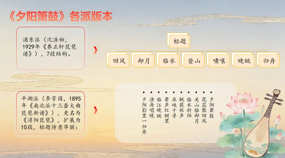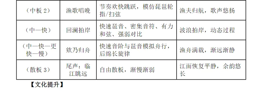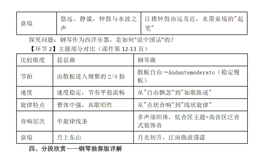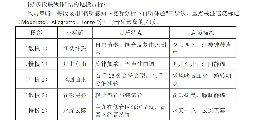 能够听辨并描述琵琶曲与钢琴曲《夕阳箫鼓》在速度、力度、音色上的差异,感受音乐中"散—慢—中—快—散"的速度布局所形成的情绪变化,体会两首作品共同营造的"春江花月夜"诗意意境。