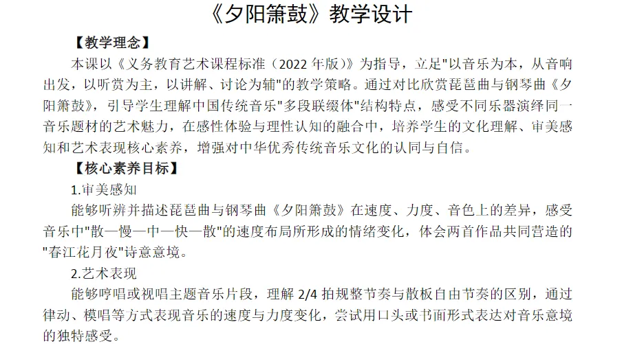 本课以《义务教育艺术课程标准(2022年版)》为指导,立足"以音乐为本,从音响出发,以听赏为主,以讲解、讨论为辅"的教学策略。通过对比欣赏琵琶曲与钢琴曲《夕阳箫鼓》,引导学生理解中国传统音乐"多段联缀体"结构特点,感受不同乐器演绎同一音乐题材的艺术魅力,在感性体验与理性认知的融合中,培养学生的文化理解、审美感知和艺术表现核心素养,增强对中华优秀传统音乐文化的认同与自信。