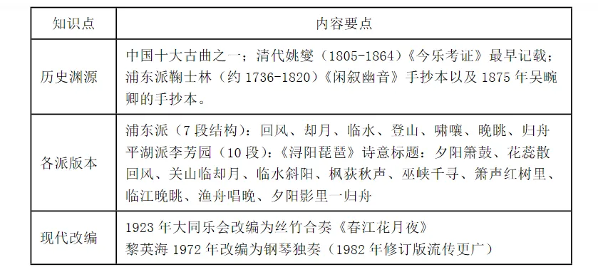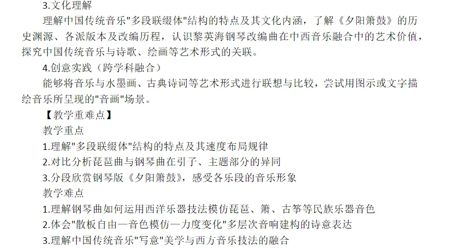 理解中国传统音乐"多段联缀体"结构的特点及其文化内涵,了解《夕阳箫鼓》的历史渊源、各派版本及改编历程,认识黎英海钢琴改编曲在中西音乐融合中的艺术价值,探究中国传统音乐与诗歌、绘画等艺术形式的关联。