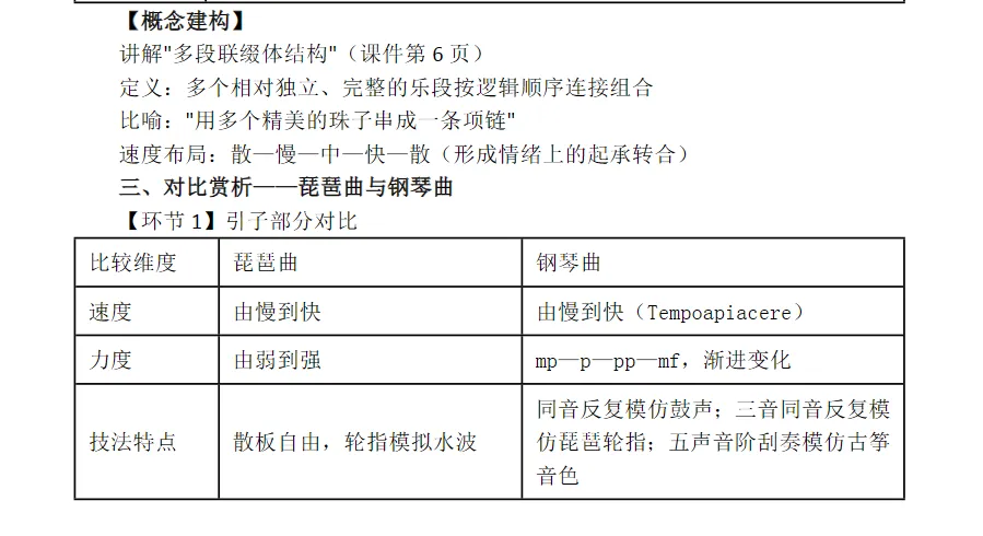 2.对比欣赏法:琵琶曲与钢琴曲的横向对比;同一作品不同段落的纵向比较