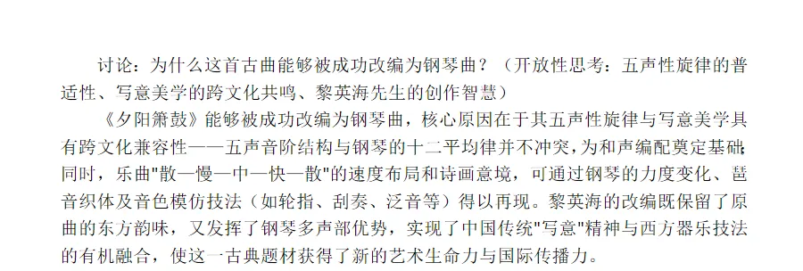 今天,我们通过对钢琴独奏版《夕阳箫鼓》的赏析,深入了解了中国传统音乐的多段联缀体结构。