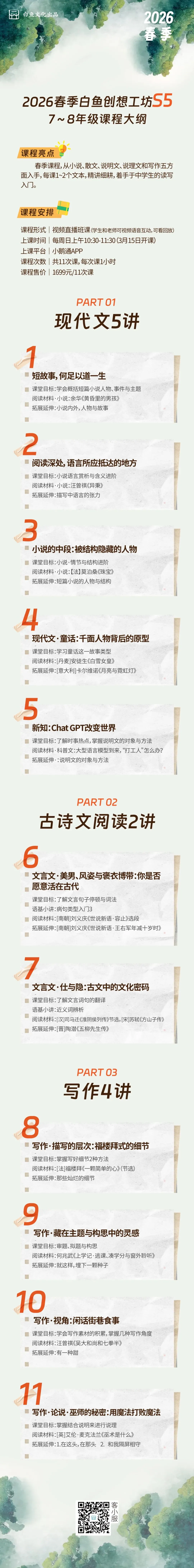 课程所讲的,都是按考纲设置,从现代文、古诗文一路讲到写作。 考虑到学生实际的阅读情况,所选的阅读文本,以中短篇为主。类型上保持一贯的丰富性:有科普文、科幻小说;有严肃文学作品,也有生活趣谈;有童话、也有奇幻小说;有历史掌故,也有诗词评弹等(详见文末课程大纲)。