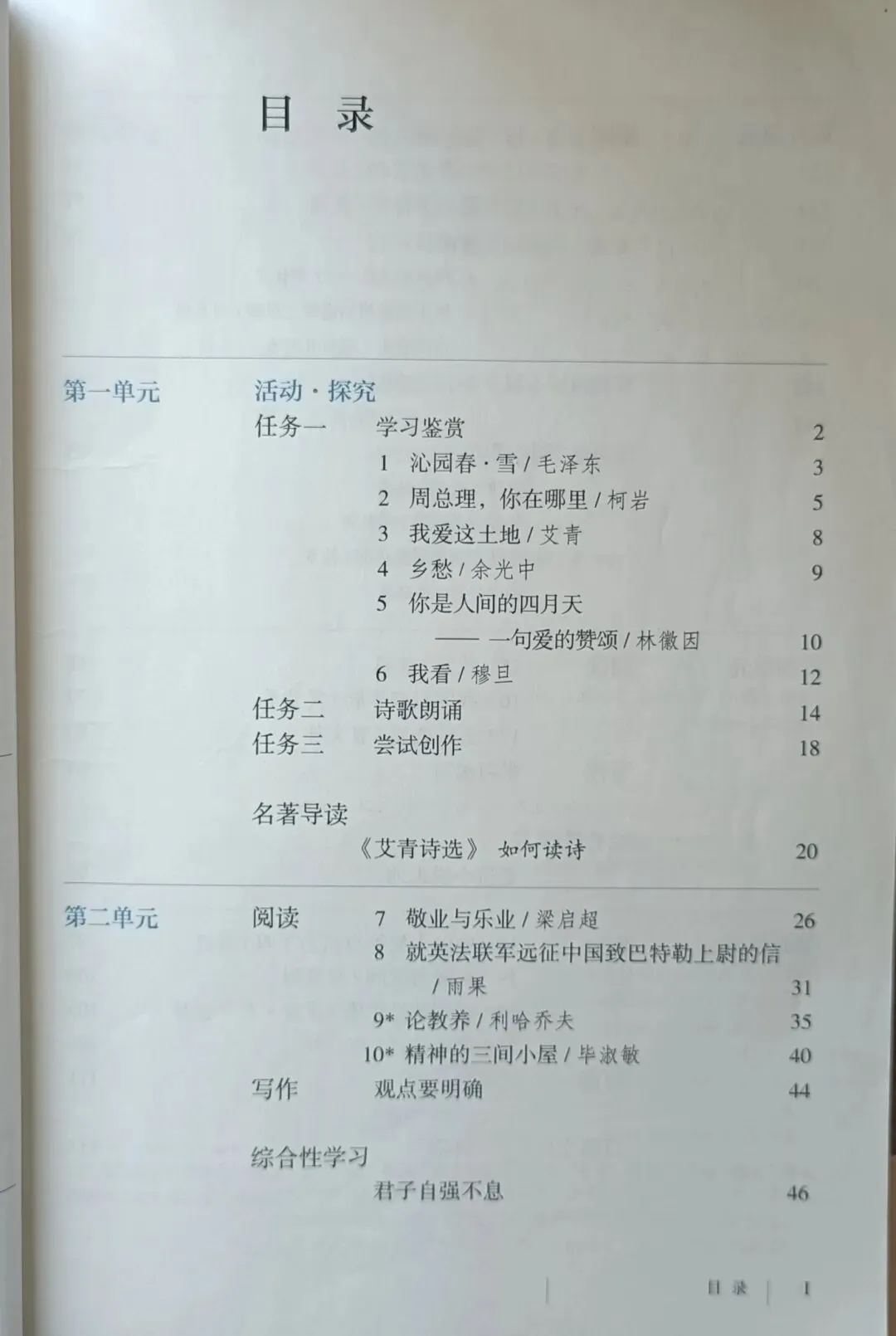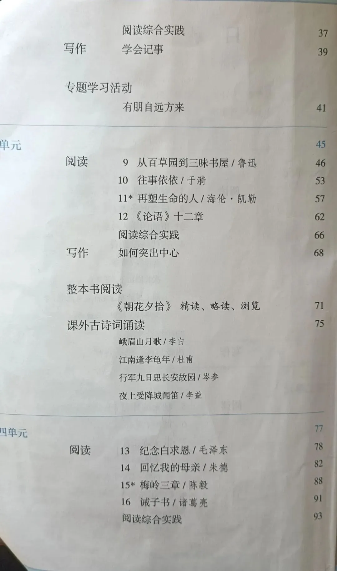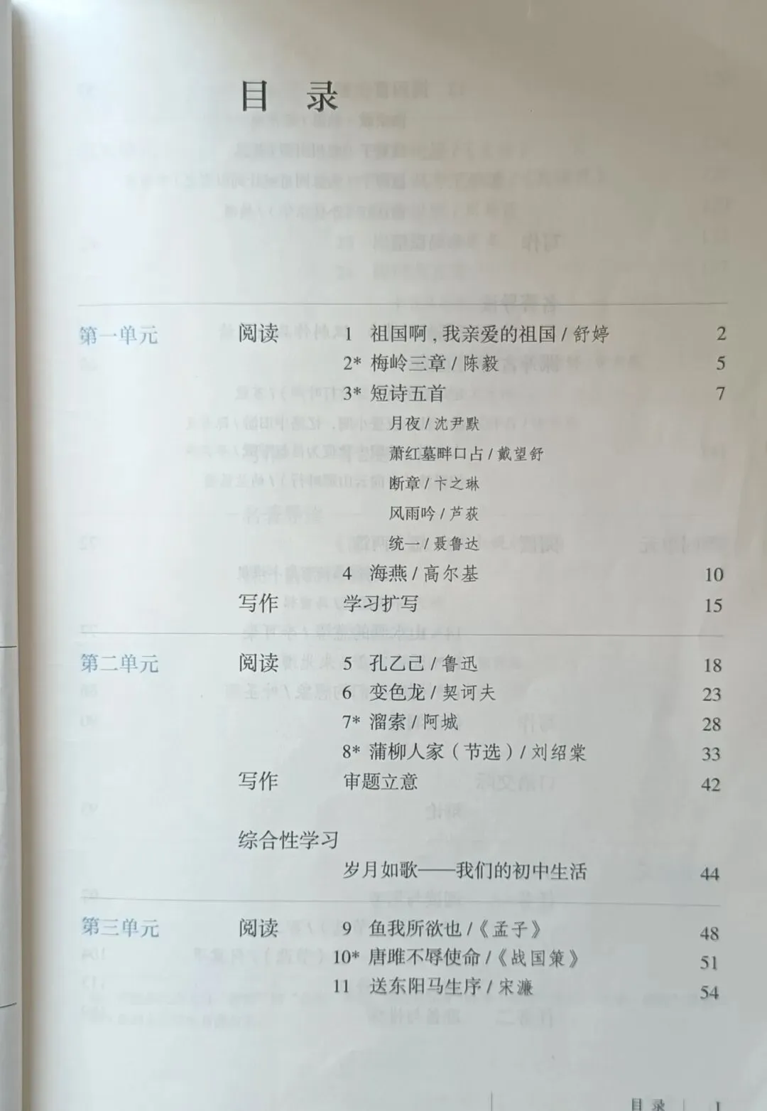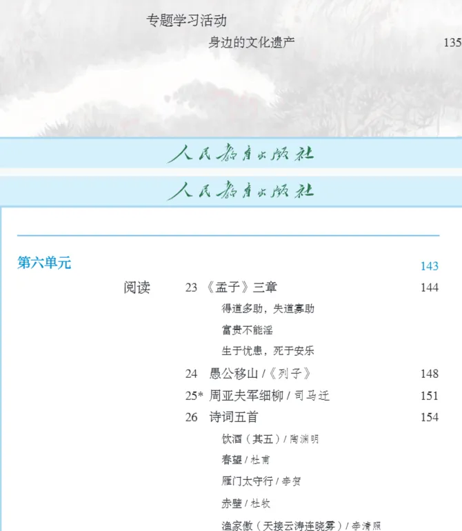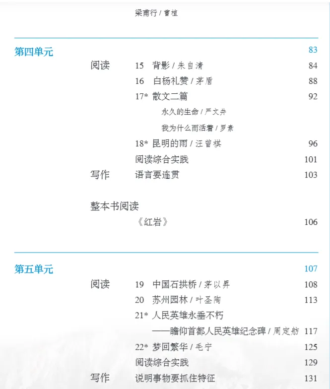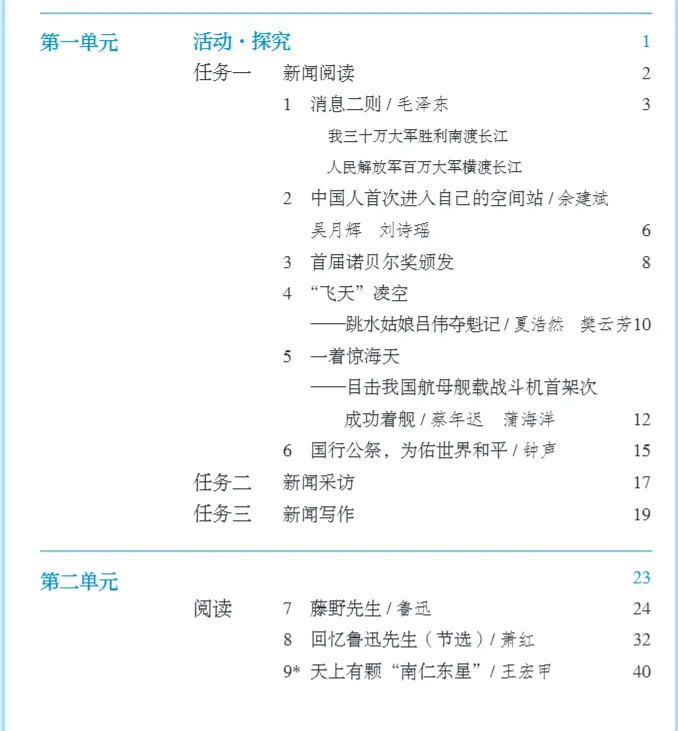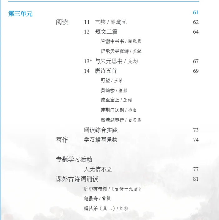 >人教版初中语文教科书七年级八年级九年级教材目录