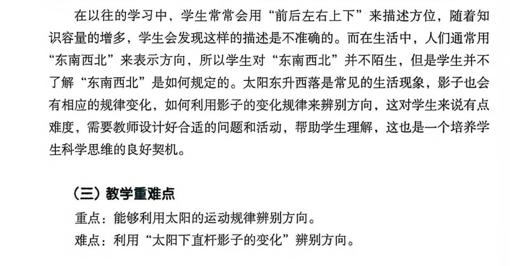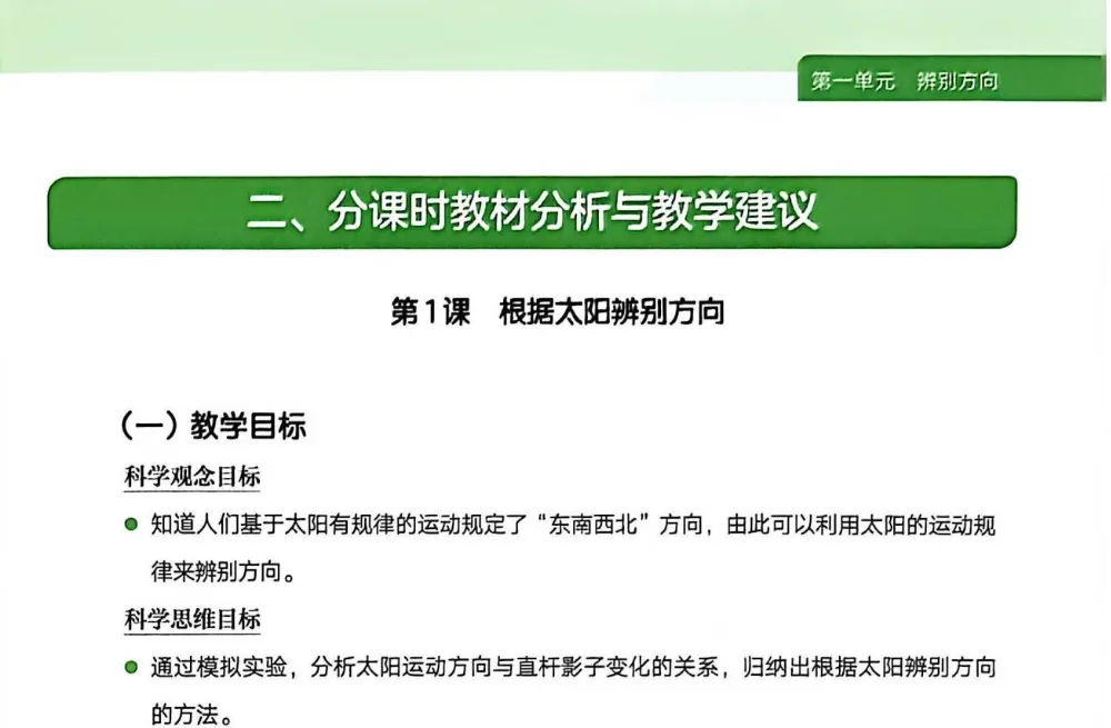 辨别方向不仅是一项实用的生存技能,更是人与自然和谐共生的智慧体现。通过本单元的学习,学生将学会如何运用这些自然规律,成为自然界中更加敏锐的观察者与智慧的探索者。