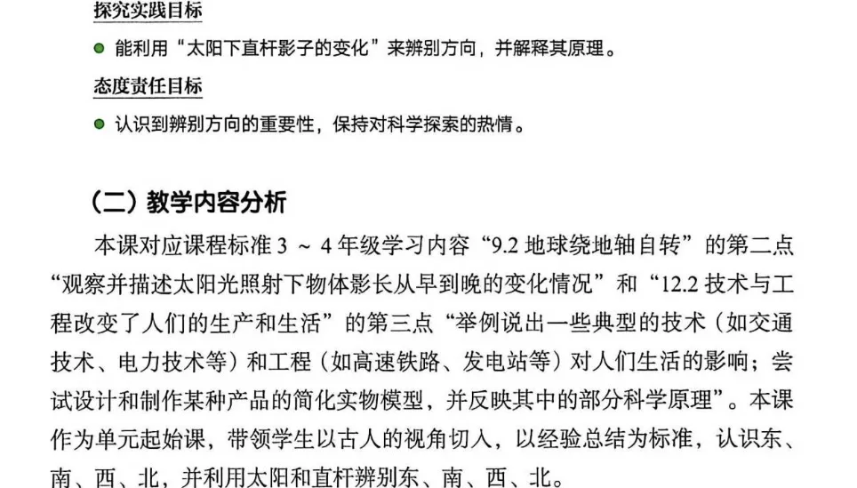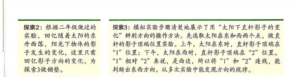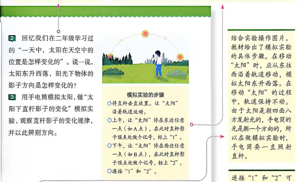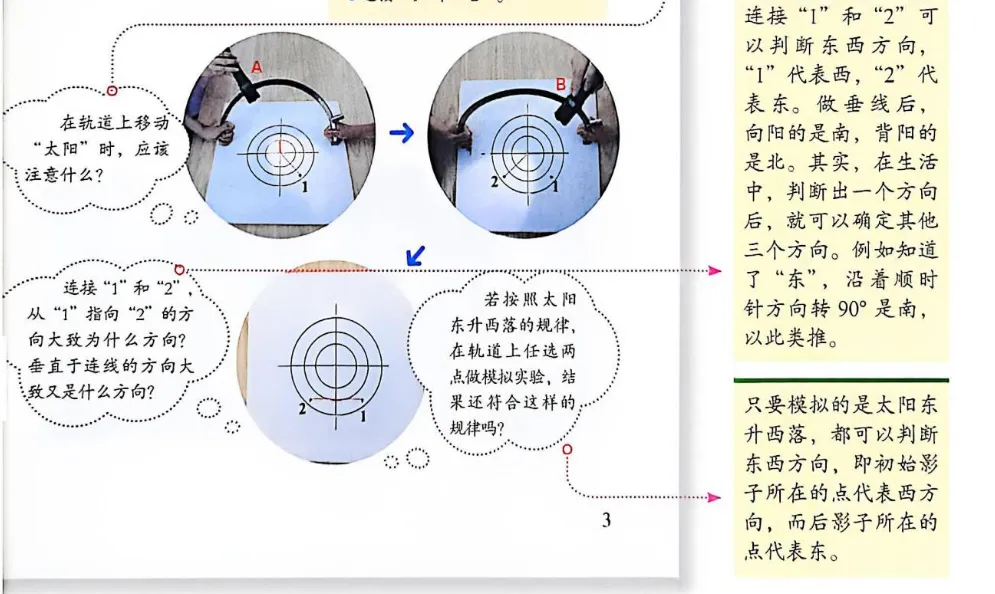 通过模拟实验,分析太阳的运动方向与直杆影子变化的关系,归纳出利用太阳快速辨别方向的方法。