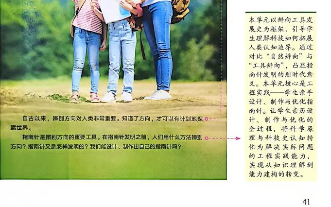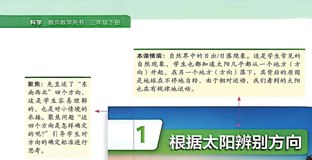 本单元的学习聚焦于“辨别”这一核心词汇,旨在引导学生深人观察自然世界,发现并利用这些规律来帮助自己辨别方向。通过观察太阳位置变化、留意树木生长方向,以及磁石的自然指向......我们能够较为准确地辨别方向。