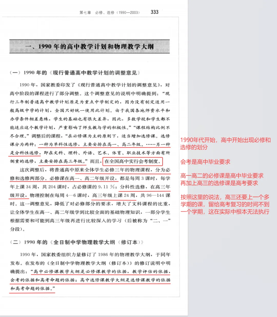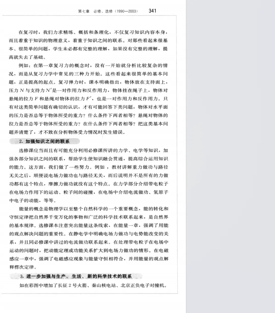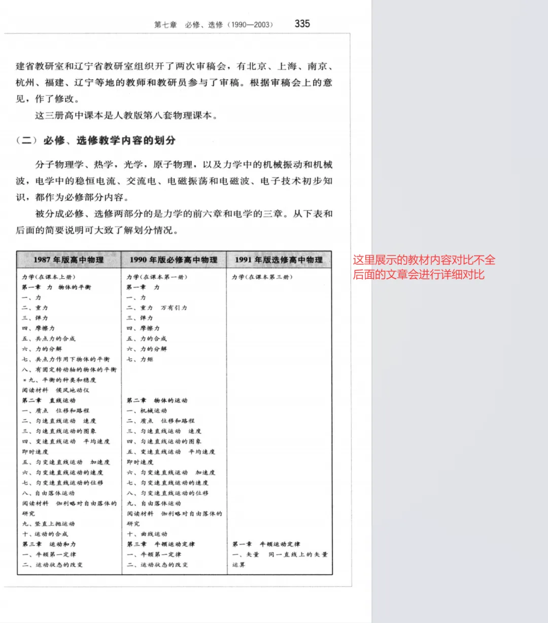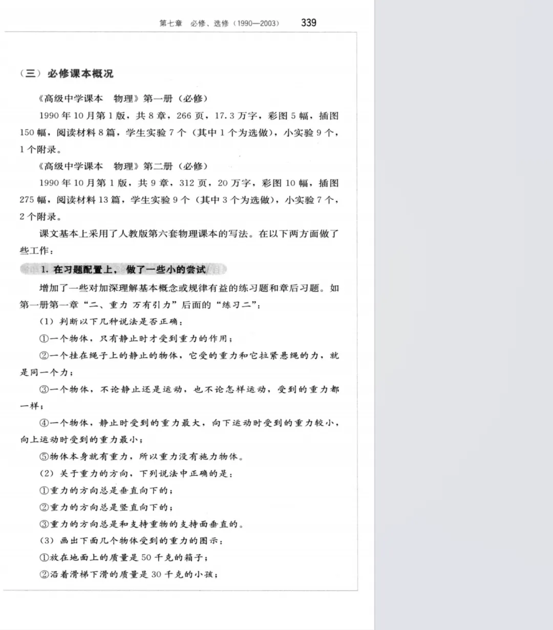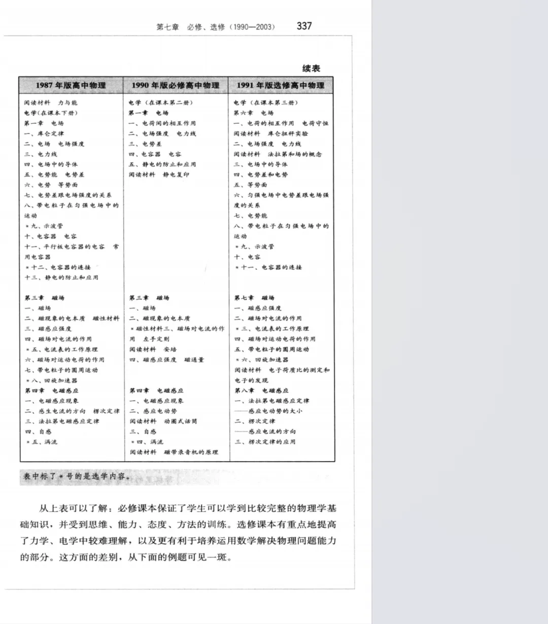 回看改革开放后的高中课程演变,可以比较明显地发现,理科课程从九十年代初期开始进入剧烈改革时期。理科课程开始出现必修和选修的划分。物理和化学改革的一个明显的方向是减少必修的内容,也就是减轻高考不考物理/化学学科的学生学习这两门课程的负担。如何确定必修课内容,如何对必修课和选修课内容进行编排,非常考验教学大纲和课程标准的制定者的能力,从后来颁布的各版教学大纲和课程标准来看,时好时坏,反复振荡。九十年代初期这版教学大纲和教材显然不算成功的案例。