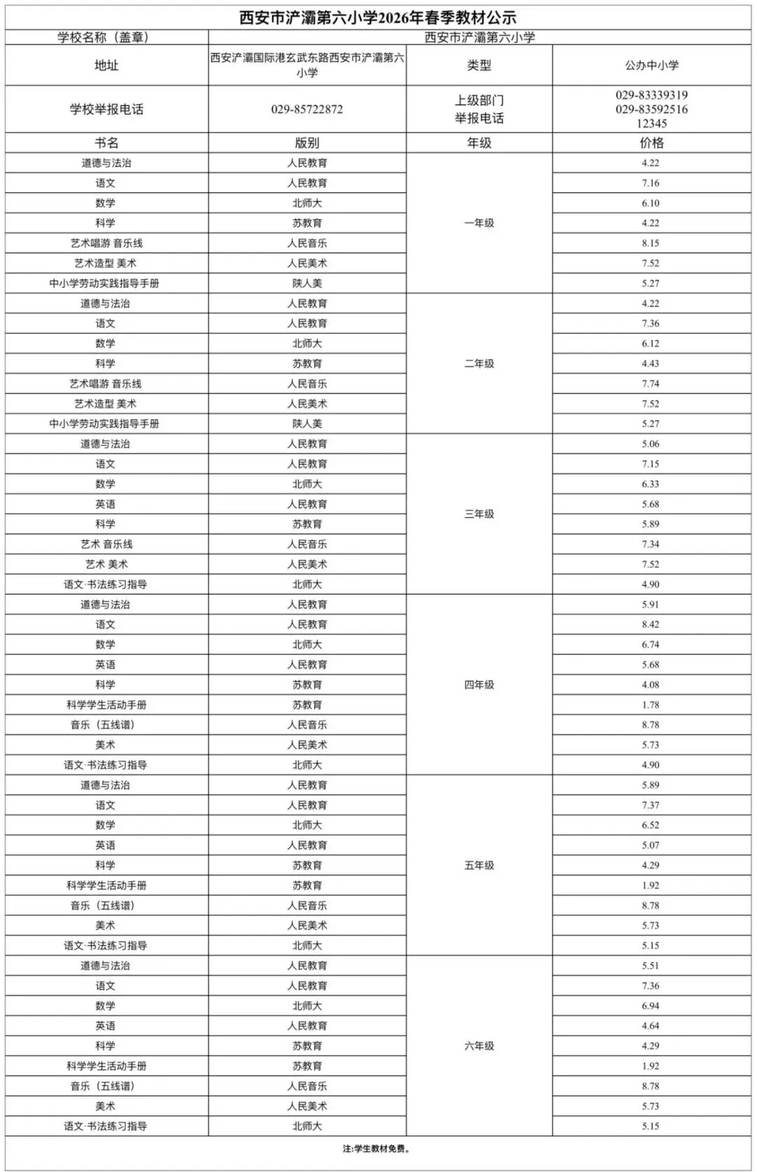 为切实加强学校教材教辅资料征订管理工作,保障征订流程规范、透明,根据陕西省教育厅办公室《关于陕西省 2025 年秋季至 2026 年春季中小学教学用书有关事项的通知》(陕教材办〔2025〕6 号)和西安市教育局《转发关于 2025 年秋季至 2026 年春季中小学教学用书有关事项的通知》(市教通〔2025〕303 号)以及西安市教育局办公室文件《关于进一步加强中小学教辅材料违规征订专项整治工作的通知》(市教办发〔2025〕171 号)文件规定,按照西安浐灞国际港教育局《关于2025年秋季普通中小学教材教辅征订工作的通知》和《关于进一步规范中小学教辅材料征订和管理工作的通知》要求,学校始终坚守“公开、公平、公正”核心准则,并严格落实“一科一辅、自愿征订”相关规定。现将学校2026年春季拟选用的教材目录进行公示,望全体师生、家长知悉。