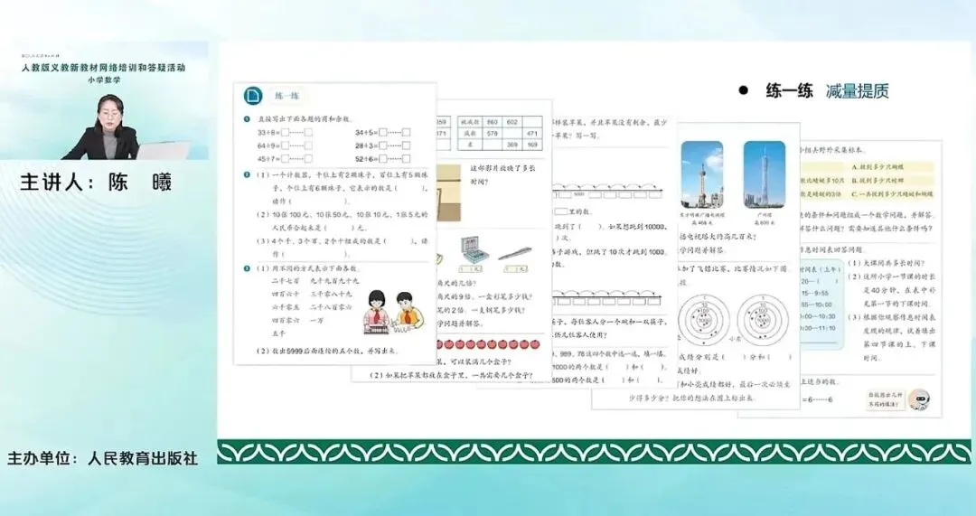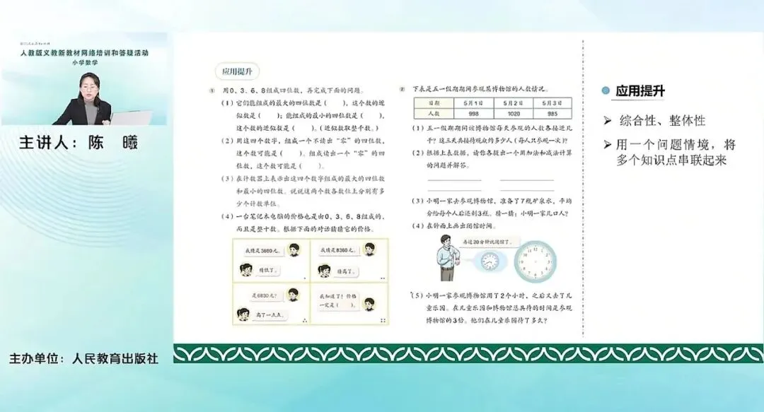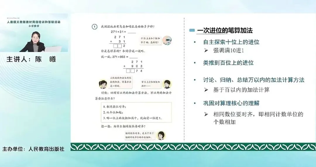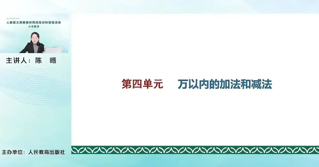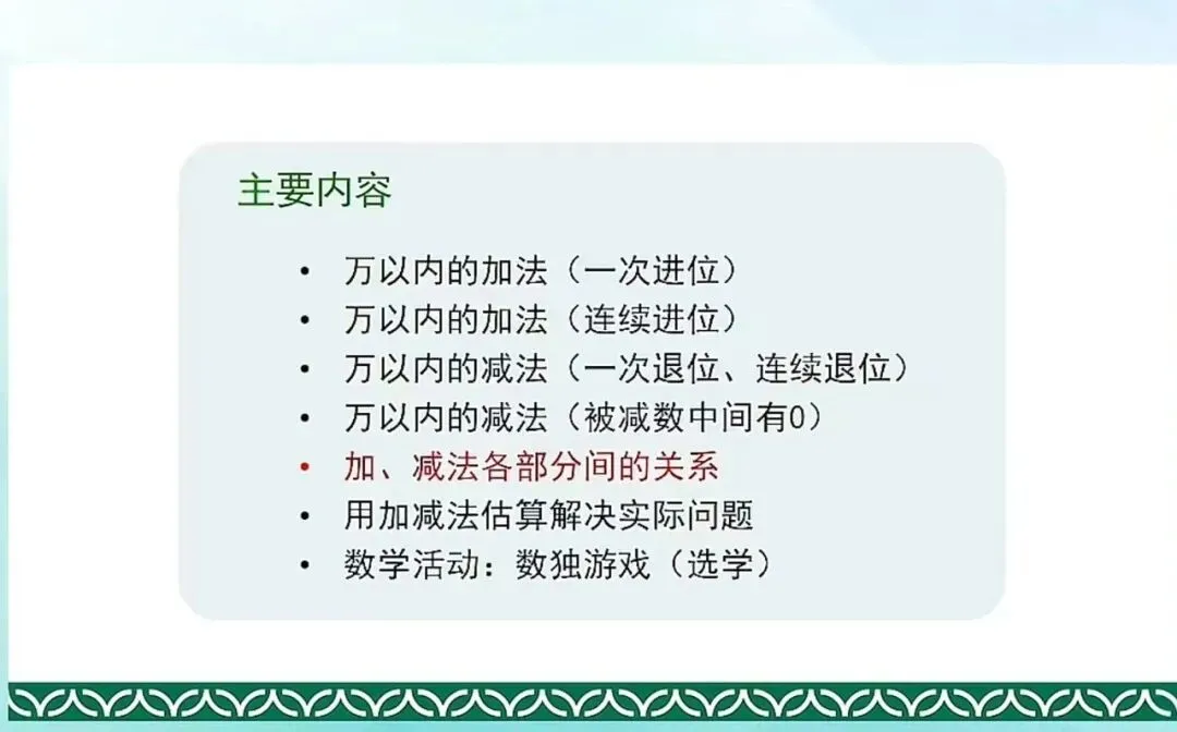刚才我们也提到了,其实就是为了进一步让学生感受到数的认识和数的加减法之间的紧密的联系,他们之间的这个核心的紧密的关系就体现在基础单位之上。后面我们可以看到。这个单元主要内容包含有万以内的加法,一次进位、连续进位;万以内的减法、一次退位、连续退位;还有重要的加减法各部分间的关系以及用加减法来估算解决实际问题。加减法各部分间的关系,这个内容原来是在我们四年级的上册来学习的,这次是把它调整到万以内的加法和减法。主要是基于到了这一册这个单元,我们整数的加减法就基本上在低学段告一个段落了。后期再要学加减法就牵扯到分数的加减法、小数的加减法,所以对于整数来说,加减法已经是小阶段性的进行一个总结。通过这样一个内容的学习,帮助学生再一次去梳理概括感受加减法的关系以及它们各部分之间的关系。对于数的运算,就是全套教材的一个整体的安排。对于刚才提到我们这册来说,运算其实就有余数的除法和万以内的加法和减法,两个单元。