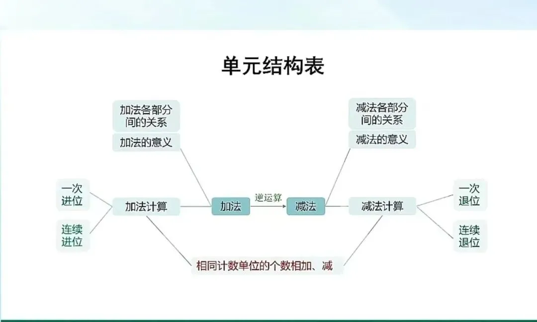 这个单元的结构来说,主要的结构就是从加法到减法,这么一个关系。加法,又分成加法计算一次进位和连续进位两个例题。减法也是分成一次退位和连续退位两个例题。它们的核心其实都是相同计数单位的个数来进行相加减。在此基础上,我们还进一步去梳理加减法的关系。减法是加法的逆运算,以及加法的意义,加法各部分之间的关系,减法的意义和减法各部分之间的关系。这样一个基本的这个逻辑关系。