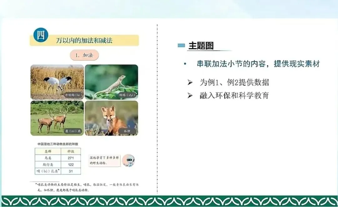 第一小节加法,主题图串联的就是加法小节的所有的例题内容,为例1例2提供了数据。并且融入了这种环保和科学教育。