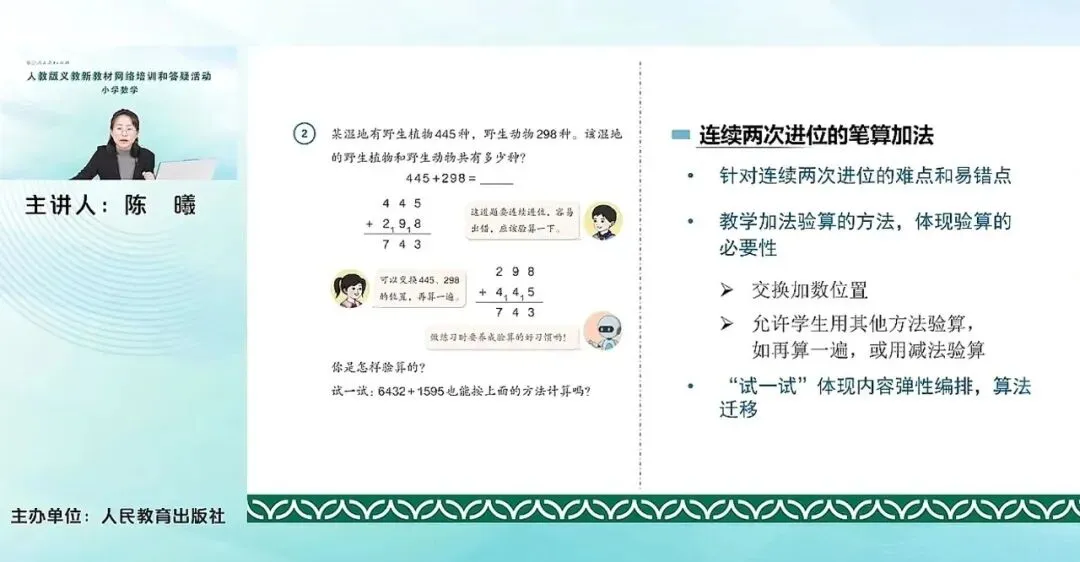 它的难点、易错点其实就是因为数更多了、更大了。连续进位的次数一多,学生就容易算错。所以这里不光是进一步巩固算理算法,更重要的是让学生通过加法验算的方法去检查我算的对不对、有没有问题,去体现验算的必要性。这里给出了两种验算的方法,一个是加数交换,另一个是再算一遍,或者是减法来验算等等。当然这个就不要求学生要在这里一定要掌握好,重要的是让学生知道一定要进行验算,尤其这种容易出错的这种地方。要养成验算的好习惯。在这个例题的最后,试一试这个环节,体现了内容编排的弹性,给出了四位数的加法的计算。这里当然不是说一定要让他去更多的练习这种四位数加法的计算。主要是让学生感受到,即使再多数位,数位增加了更多以后,它的算法算理都是一致的,可以把前面的算法算理的经验再迁移过来进行计算。
