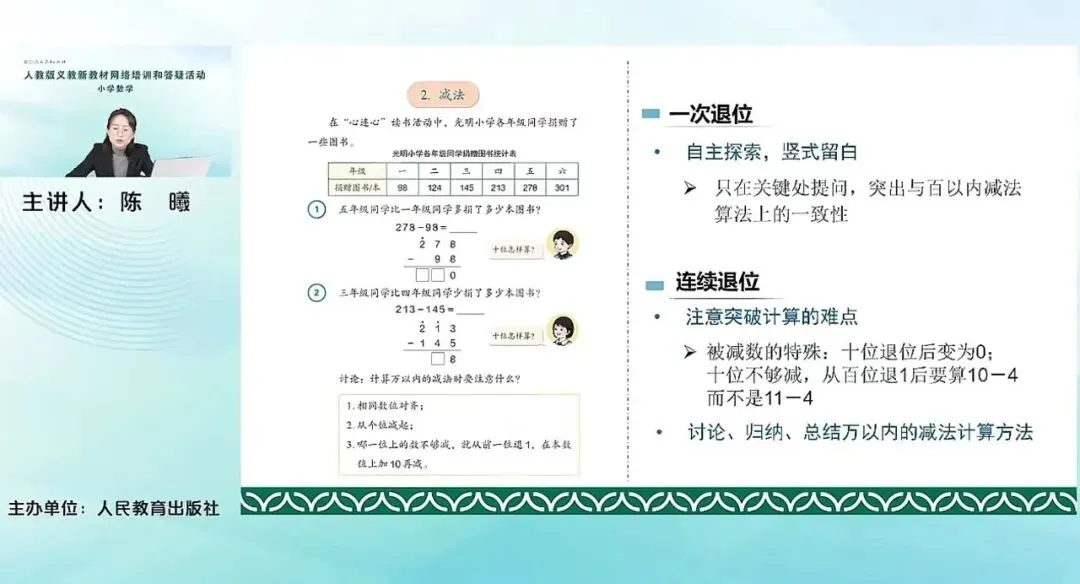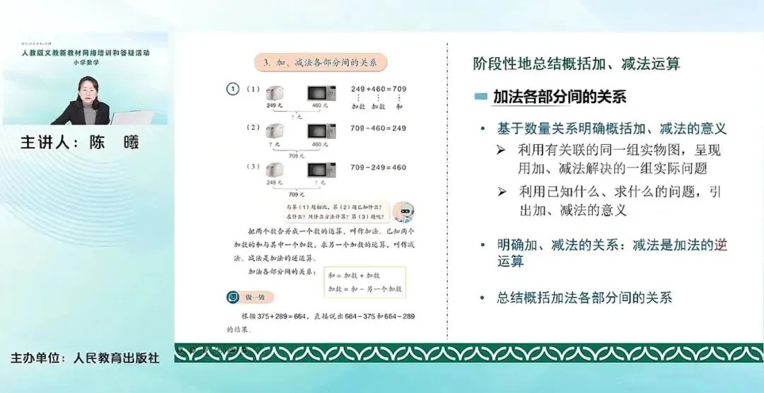 刚才提到这里其实是阶段性的总结加减法运算。通过两个例题,先加法各部分间的关系,再减法各部分间的关系,进一步通过这种具体的事物,有关联的这个事物呈现出来。三组问题。通过已知什么、求什么这些问题来引出加减法的意义,明确加减法的关系,减法是加法的逆运算。最后总结概括各部分间的这个关系。老师们可以看到,其实这两个例题,例1和例2是把加法和减法各部分间的关系分开进行教学。因为在上一套教材中,把加法和减法结合在一起进行各部分间的关系的教学的。结合在一起就是学生在说着说着就会把两套系统的名称混淆在一起。说加法的时候,可能会又提到被减数和差这样一个关系。说减法各部分间的名称,说的时候又会说到和和加数的这个问题。所以分开两个例题,便于学生来具体的、分别的去展开各个系统下加法和减法各部分间的关系,也有有利于他们去进一步总结概括各方面的关系。有了这个总结概括以后,也就方便我们用验算来进行万以内的这个加减法的计算,其实利用的就是加减法之间的这个关系。