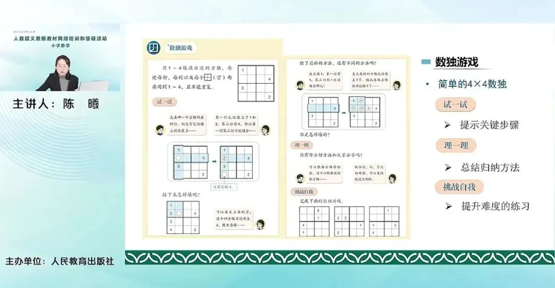 在本单元的最后,是安排了一个选学内容:数独游戏。这种简单的4×4的数独游戏。这里也是给出来了几个小环节,帮助我们老师能够引导学生来完成这个数学游戏。试一试、理一理、挑战自我。通过这三个步骤可以进行。第一个试一试其实就是对一些让学生自主去尝试,然后提示一些关键的步骤。理一理,就是通过完成这个数学游戏,进行一个总结归纳去看到有的地方我可以怎样处理来解决这个困难,通过总结归纳提升学生的总结概括的能力。到了挑战自我,就是更有难度一点的数独游戏,帮助学生进一步去进行一个推理的一个过程。让他们觉得数学推理很好玩。