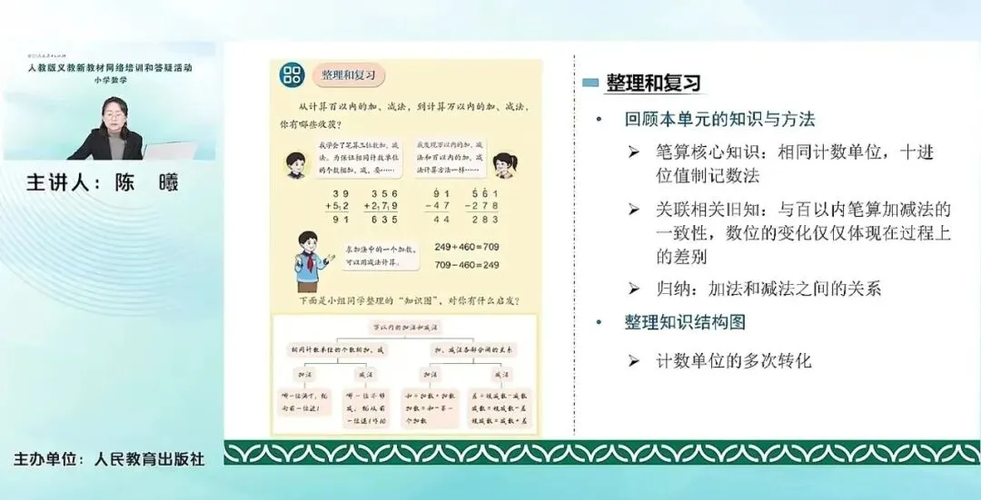 本单元的最后整理和复习,也是分成了两个层次,回顾本单元的知识和方法。知识和方法主要“知识”上来说就是认数的核心,其实和认数核心是类似的,就是计数单位的这个核心地位,以及实际位置制计数法表示数的方法。“方法”上来说,其实计算方法跟百以内的这个计算方法是类似的,它的变化主要就是体现在数位更多了,所以它的计算难度也有所增加,但是其实方法和道理都是相通的。其次,教材还用学生的话去帮助学生进一步总结归纳,加法和减法之间的关系,去梳理加减法部分之间的关系。知识整理的结构图来说,这里给出来的是相对概括的,对于学生来说也可以有自己的这种整理的方式。可以给出一些一般的这种小例子来进行一个整理,重要的是体会出其中的结论,加法减法它的核心其实就是相同计数单位的个数相加减。计数单位的转化。