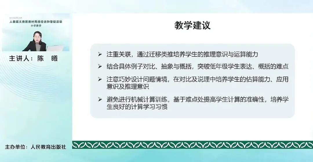 主要是第一条是注重关联,通过迁移类推培养学生的推理意识与运算能能力。它的关联主要就是体现在与百以内数的加法减法之间的这种关系,怎么样把旧知识的知识储备迁移到新知识的这个学习上来。