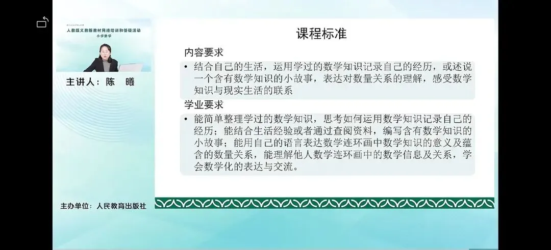 这是一个简单的跨学科的主题活动。这个主题活动,其实是要让学生去结合自己的生活,运用学过的数学知识记录自己的经历,去讲一个小小的数学知识的小故事,表达一些小的数学问题等等。让他去感受数学知识和现实生活的联系。这是课程标准中要求的内容要求和学业要求。