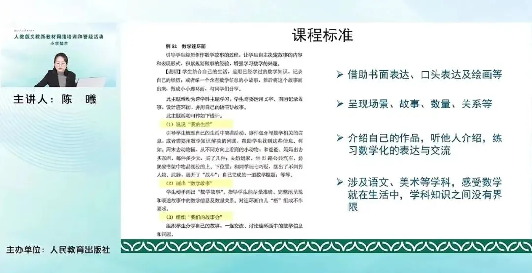 比如说,说说我的生活,画出数学故事,组织我们的故事会等等。这是老师们看到标题应该就能大体脑海中已经有所感受这个活动具体应该怎么去设计。这里我们还可以和我们语文课或者美术课做一个学科的融合的这个活动,去感受各学科之间其实没有一个明显的边界,其实数学就在我们的生活之中。
