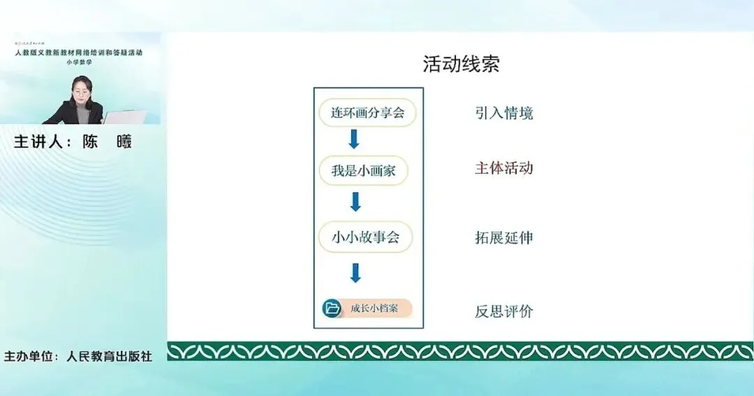 这个活动的主体活动是我是小画家,也就是去设计制作数学连环画的过程。在活动的准备环节,其实就是让学生知道什么是数学连环画,也就是引入活动情境本身的环节--连环画分享会。然后主体活动之后,还可以开展一些拓展延伸,让学生互相交流分享,然后给其他的同学提提建议等等这些进行主题分享活动,最后是反思评价。