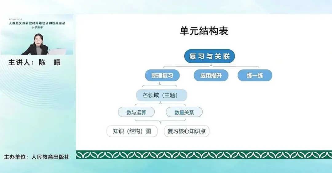 复习与关联,在每一册的最后一个单元叫复习与关联,其实就提示老师,我们的这个单元不仅仅是要进行一个复习整理的过程,更重要的是把各个单元之间有没有联系进行一个梳理归纳看看它们之间有哪些关系。这是我们单元整体的结构表。