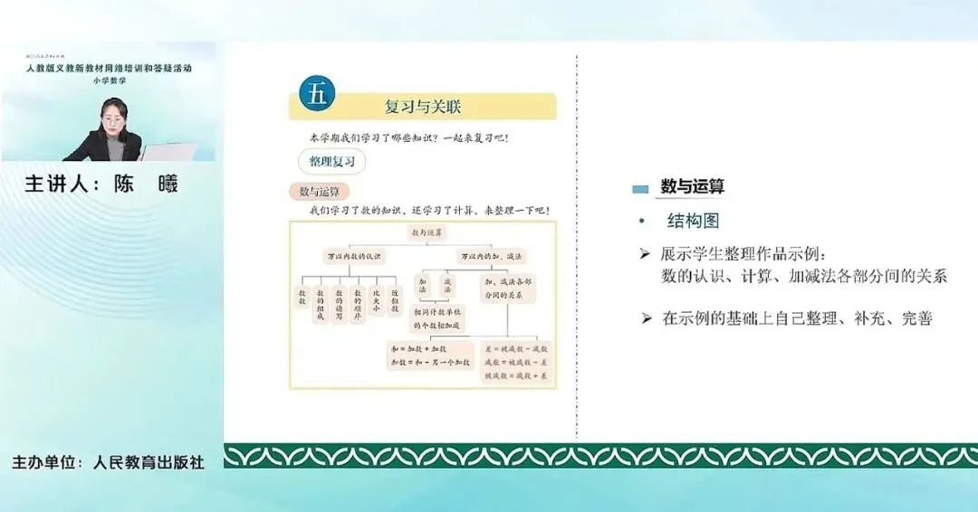 数与运算这里首先是展示了一个学生的作品,给出来了这一册教材中“数的认识”和“计算”方面在“数与运算”主题下的万以内数的认识和万以内的加减法,这两部分内容的这个结构图。当然在教材里,我们给出的知识图也是有版面有限。我们在具体的教学中,老师可以在这个示例的基础上,引导学生进一步整理、补充和完善。在知识图的基础上,就对这个单元,这个内容本身再进一步进行梳理。和万以内数的认识和计算有关的,很重要的核心就是比如说计数单位、数位顺序表、数的顺序、加减法,包括后面还有有余数的除法内容相关的这种结构,都放在这个主题数运算之下来完成。