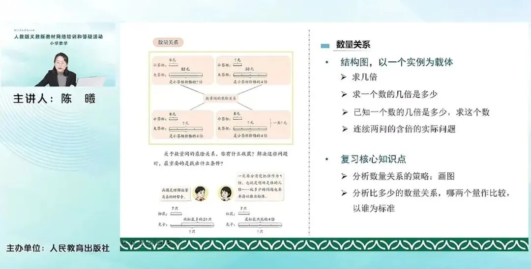 在“数量关系”这个主题下,教材也是先给出来一个结构图,以一个实例作为载体,给出来四种类型,求几倍、求一个数的几倍是多少、已知一个数的几倍是多少求这个数、以及连续两问的,含倍的这种实际问题,帮助学生把这个册次内数量关系处理一下的实际问题都梳理出来。然后复习核心的知识点,去对比和原来加减关系之间这个倍数关系,它有什么关系?它都是在做比较。只是这个标准如何找的这个问题。包括这种画图的,很重要的分析数量关系的这个工具,也是复习的核心知识点。