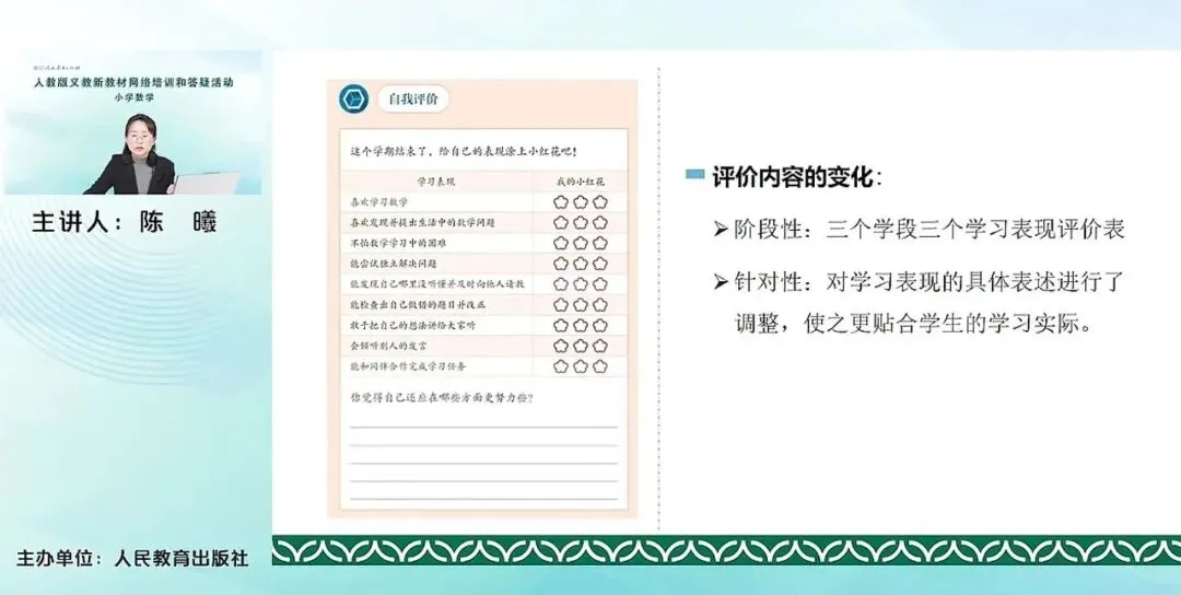 在本册的最后,同样也是给出了评价内容,一个自我评价表。当然这个自我评价表是我们第一学段一二年级都相同,都是一个学习评价表。到了第二学段、第三学段,每一个学段的表现评价表都不太一样,是有针对性的给出来对学生学习表现的具体表述,进行了调整,帮助这个学生能够更贴切的去反思评价自己在这学期的实际的学习的表现。
