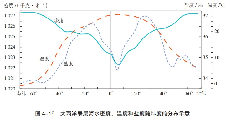 2.读图4-19、图4-20,说出海洋表层海水密度随纬度变化的特点,以及不同纬度海水密度随深度变化的特点,并简要分析成因。