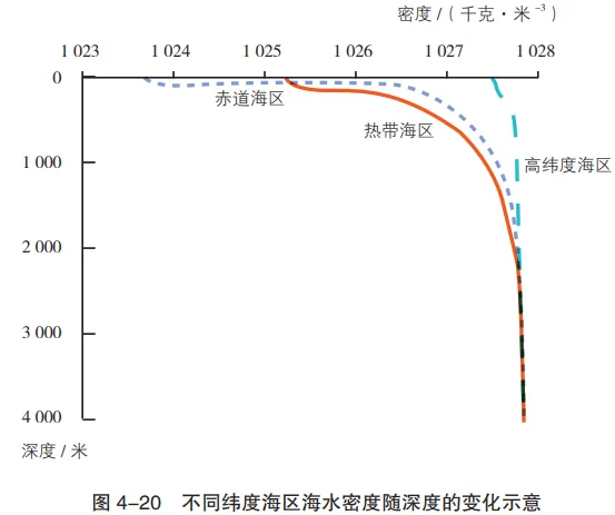 成因:海水密度的变化主要取决于海水温度的变化。低纬度从赤道到副热带海区,表层水温较高,密度较小。但因海水热导率低,随着深度的增加,水温迅速降低,海水密度也迅速增加。但到2000米以下,海水温度基本保持稳定,密度也基本不变。高纬度海区,表层海水温度较低,且随深度增加水温下降较小,所以海水密度在垂向上的变化也很小。
