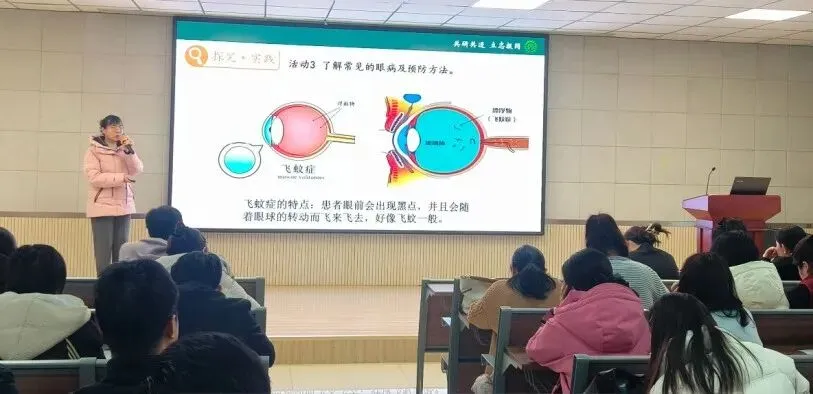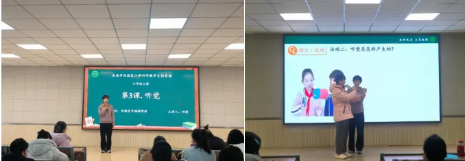 紧接着,刘娇老师带来《听觉》一课的模拟讲课,她不仅精准把握教材重难点,设计了生动有趣的教学环节,还现场开展了听觉模拟实验,邀请参训教师参与互动体验。在动手操作与互动探究中,老师们直观感受了听觉形成的科学原理,也学会了如何将趣味实验融入课堂。