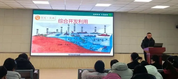 曹文国老师开展《海洋资源》一课的模拟讲课。曹文国老师凭借多年的科学教学经验,课堂设计沉稳扎实、亮点纷呈,既注重科学知识的精准传授,又融入了对海洋资源保护的情感教育,毫无保留地将宝贵经验传递给各位老师。
