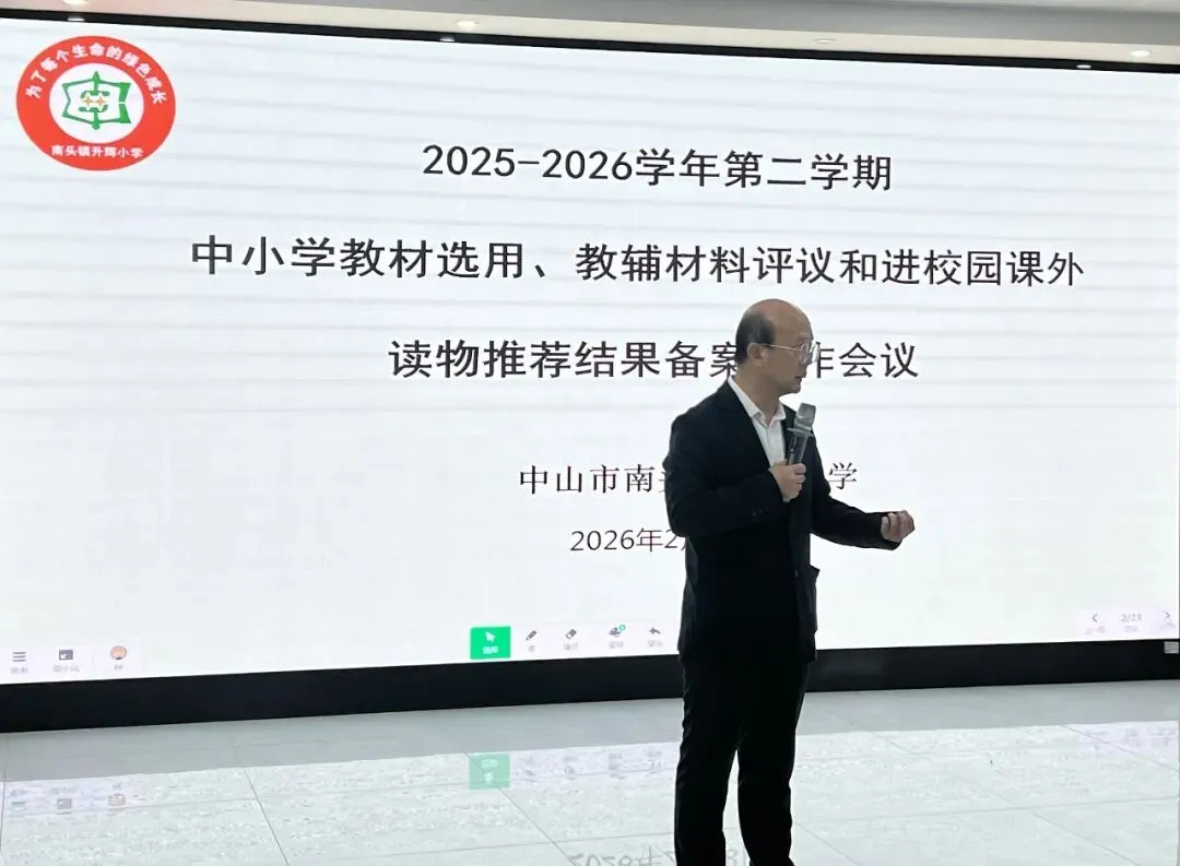 为进一步规范校园教学资源管理,筑牢育人根基,2026年2月28日上午,南头镇升辉小学开展了2025-2026学年第二学期中小学教材选用、教辅材料评议和进校园课外读物推荐结果备案工作会议。学校全体教师参会,会议由教导处主任卢艺莹主持。