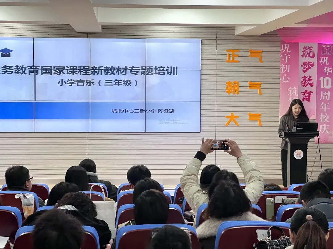 首先,来自北京市昌平区南口铁道北小学的屈盈楠老师,围绕小学二年级下册音乐教材,从政策背景与教材特征两方面进行了深入剖析。她指出,随着2022年版《义务教育课程方案》的出台,音乐教育迎来了新的变革,一至七年级以音乐、美术为主线,融入舞蹈、戏剧、影视等内容,强调课程的综合性和关联性。新版教材因此突出了两大特征:艺术综合与连续性和进阶性。