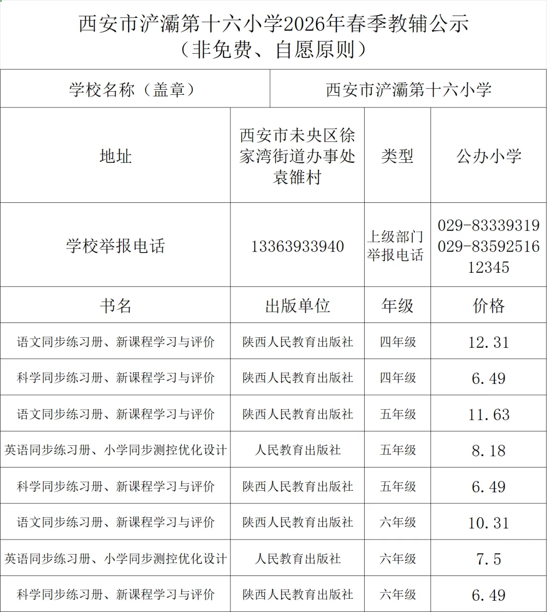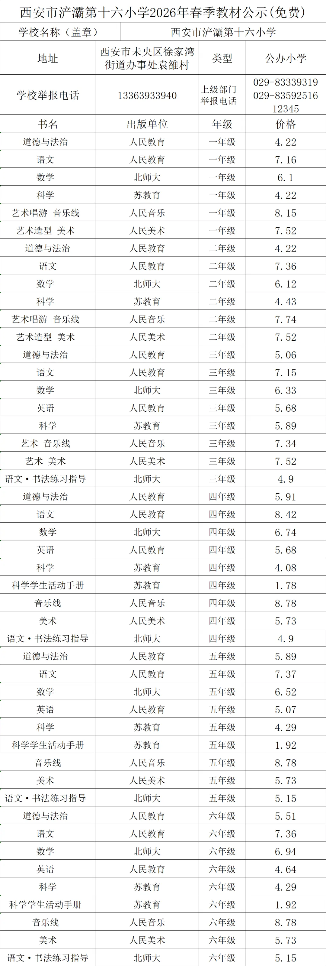 西安市浐灞第十六小学2026年春季使用教材目录公示