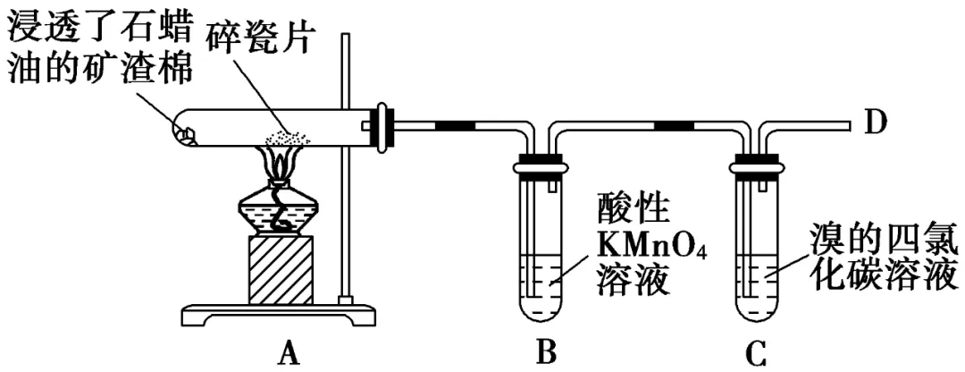 现象与解释:B中溶液紫红色褪去,C中溶液红棕色褪去,D处点燃火焰明亮并伴有黑烟。石蜡油在炽热碎瓷片的作用下,产生可以使酸性高锰酸钾溶液和溴的四氯化碳溶液褪色的气态产物,主要是乙烯和烷烃的混合物。