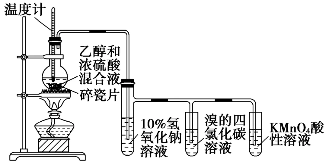 现象与解释:加热混合液时,温度要迅速上升到并稳定于170 ℃左右,生成乙烯;浓硫酸起催化剂和脱水剂的作用。由于反应物都是液体而无固体,所以要向烧瓶中加入碎瓷片,以防液体受热时发生暴沸;温度计要选择量程在200~300 ℃的为宜。温度计的水银球要置于反应液的中央位置,因为需要测量的是反应液的温度;氢氧化钠溶液的作用是除去混在乙烯中的CO2、SO2等杂质,防止干扰乙烯与溴的四氯化碳溶液和KMnO4酸性溶液的反应。