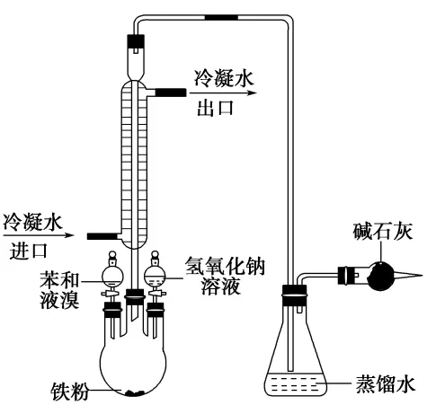 现象与解释:苯不能使KMnO4酸性溶液褪去,说明苯分子中不存在碳碳双键或碳碳三键。甲苯、二甲苯能使KMnO4酸性溶液褪去,苯说明甲苯、二甲苯能被KMnO4氧化。实验:在三颈烧瓶中加入少量铁粉,向三颈烧瓶上的一个滴液漏斗中加入5 mL苯和1 mL液溴的混合物,另一个滴液漏斗中加入30 mL 10%的氢氧化钠溶液,锥形瓶内注入蒸馏水,干燥管中加入碱石灰,连接好仪器,检查装置的气密性。先向三颈烧瓶中加入苯和液溴的混合物,观察三颈烧瓶和锥形瓶中出现的现象。反应完毕后,向三颈烧瓶中加入氢氧化钠溶液,观察三颈烧瓶中生成物的状态。