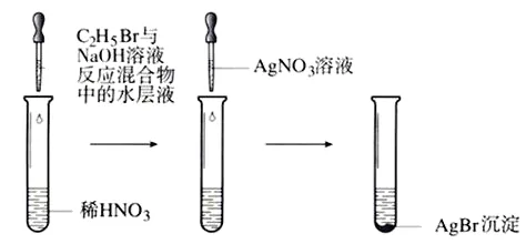 实验:取一支试管,滴入10滴~15滴溴乙烷,再加入1mL5%的NaOH溶液,充分振荡、静置,待液体分层后,用滴管小心吸入10滴上层水溶液,移入另一盛有10mL稀硝酸溶液的试管中,然后加入2滴~3滴2%的AgNO3溶液,观察反应现象。