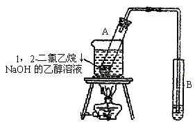 实验:在试管里加入2mL1,2-二氯乙烷和5 mL10%NaOH的乙醇溶液。再向试管中加入几块碎瓷片。在另一支试管中加入少量溴水。用水浴加热试管里的混合物(注意不要使水沸腾),持续加热一段时间后,把生成的气体通入溴水中,观察有什么现象发生。