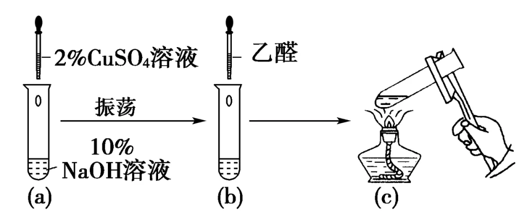 现象与解释:可以看到,溶液中有红色沉淀产生。反应中产生的Cu(OH)2被乙醛还原成Cu2O。醛基能将新制的Cu(OH)2还原为红色的Cu2O沉淀,这是检验醛基的另一种方法。该实验注意以下几点:①所用Cu(OH)2必须是新制的,在制备Cu(OH)2时,应向NaOH溶液中滴加少量硫酸铜,NaOH溶液必须明显过量。②加热时须将混合溶液加热至沸腾,才有明显的红色沉淀产生。③加热煮沸时间不能过久,过久将出现黑色沉淀,原因是Cu(OH)2受热分解为CuO。