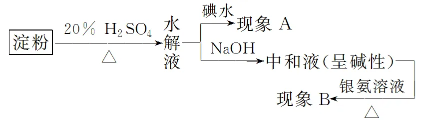 现象与解释:蔗糖不发生银镜反应,说明蔗糖分子中不含醛基,不显还原性。蔗糖在硫酸的催化作用下,发生水解反应的产物具有还原性。实验:在试管1和试管2里各放入0.5g淀粉,在试管1里加入4mL 20%的H2SO4溶液,在试管2里加入4mL水,都加热3min~4min。用碱液中和试管1里的H2SO4溶液,把一部分液体倒入试管3。在试管2和试管3里都加入碘溶液,观察有没有蓝色出现。在试管1里加入银氨溶液,稍加热后,观察试管内壁有无银镜出现。