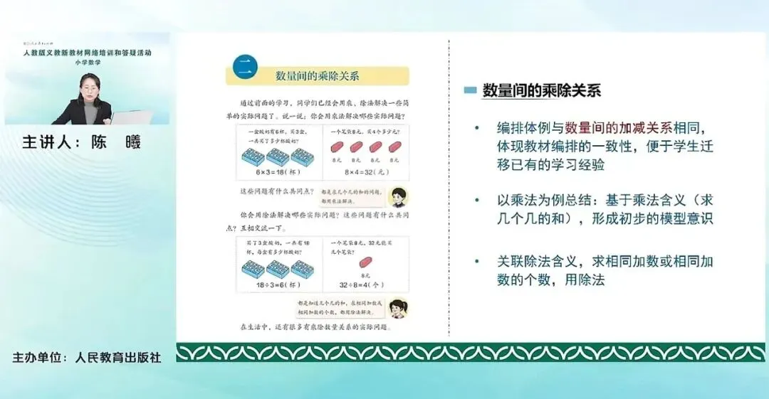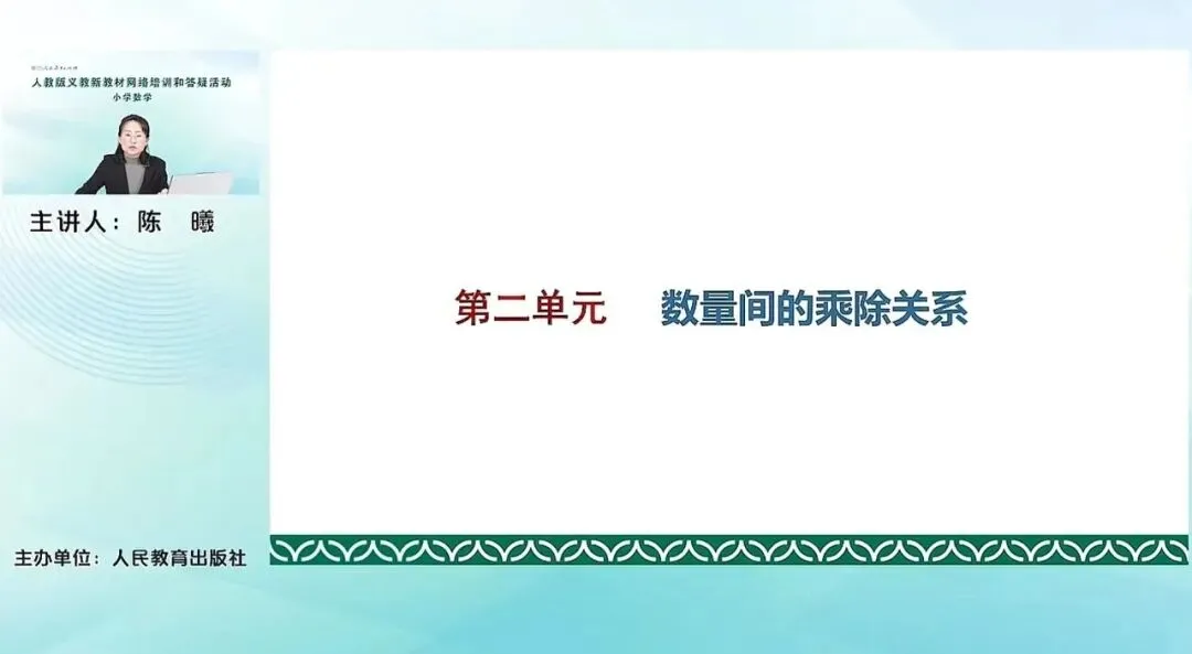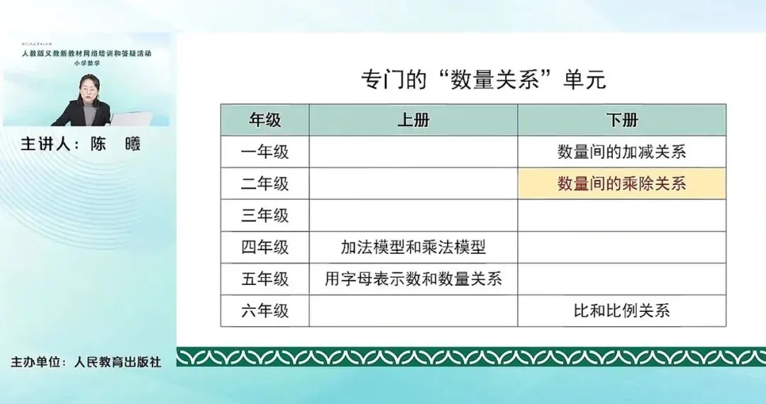 比如我们原来已经学习过的一年级下册的数量间的加减关系,到了本册就是数量间的乘除关系。到了高年级四年级还要学习加法模型、乘法模型,五年级要学习用字母表示数和数量关系,还有六年级的比和比例关系等等这些单元,都是专门的数量关系的单元。这个单元数量间的乘除关系,它的教学内容主要是包含这几个方面。