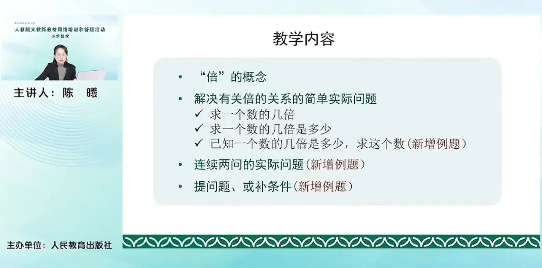 第一个内容当然是非常重要“倍”的概念,这个概念也是后续学习分数、学习分数的解决实际问题等等相关内容的一个非常重要的知识基础。然后接下来是解决有关倍的关系的简单实际问题。这里包含了三类实际问题,求一个数的几倍,求一个数的几倍是多少,已知一个数的几倍是多少求这个数,这三类。简单的这种实际问题,其实是一个基本模型下的三个变式。第三个问题是一个新增的例题。然后是连续两问的实际问题,以及提问题或者补条件这类简单的实际问题。后续我们再来具体地看。