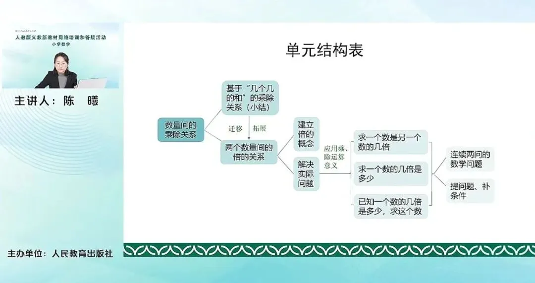 数量间的乘除关系,首先它是要基于几个几的和的乘除关系,做一个小结。其次引出倍这个概念,两个数量间的倍的关系概念。它其实是在几个几的和的基础上进行的一个迁移和拓展。在数量间的倍的关系的问题之下就有两个基本的内容,一个是倍的概念的建立。其次是与倍有关的实际问题的解决。也就是刚才我们提到的三个变式的简单的实际问题。他们需要运用的就是前面的小结中提到的乘除运算的定律。然后,最后在此基础上就要进行一个连续两问的数学问题的解决,以及提问题和补条件,这两类问题。这是本单元的结构表。