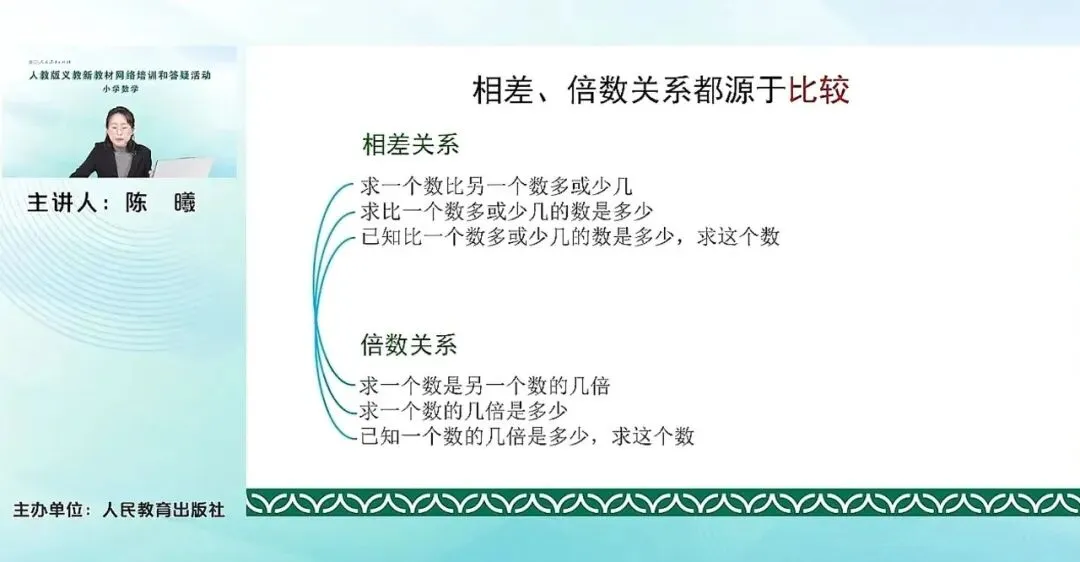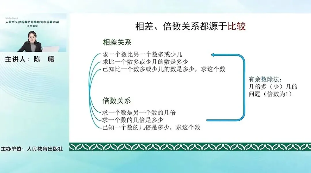 相差关系我们前面有学到。这三类,求一个数比另一个数多或少几,求比一个数多或少几的数是多少,已知比一个数多或少几的数是多少,求这个数。其实这三个问题都是在同一个相差关系之下,求的是不同的量。那它与倍数关系相比,其实它们之间是有很多关联的地方。比如说,求一个数比另一个数多或少几,和求一个数是另一个数的几倍之间,它们其实是类似的,都是一个是求的是差,一个是求的是倍。这两类,求比一个数多或少几的数是多少,和求一个数的几倍是多少,都是求的是这个比较量后面的这个量是多少。以至于比一个数多或少几的数是多少,求这个数,和下面倍数关系中,已知一个数的几倍是多少,求这个数。这两个问题之间其实也是有关联的,他们求的是原来的这个标准量,比较的原来的这个量。所以其实可以看到这两个关系,虽然他们本质上其实是用加减还是用乘除的这个问题,但是其实他们的关系上来说都是比较的关系。那其中的这个求一个数的几倍是多少和求一个数比另一个数多或少几,这两个问题其实可以看作是求几倍多几的问题。就是倍数为1的这种有余数除法的这个问题。所以这两个关系,它们是有很多共通之处的。