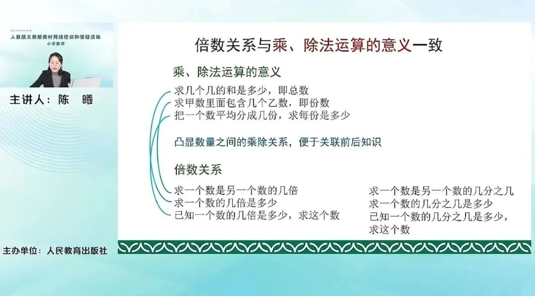 当然我们这个单元学习的意义,它后面还将进一步延伸到,求一个数是另一个数的几分之几。求一个数的几分之几是多少,这种分数关系以下的倍数关系。这其实本质上它还是倍数关系,只是看这个是整数倍还是分数倍,这样一个关系。所以刚才提到的我们这个单元刚开始的时候就要去做的一件事情,就是总结乘除法意义。什么样的情况用乘法?求几个几的和的问题就用乘法。什么样的问题用除法?求相同加数或相同加数的个数的时候就用除法。这与我们一年级下册数量间的加减关系的第一个篇章是相同的,都是通过总结前面的一些解决问题的经验。进行一个概括梳理,去看哪些问题。用什么样的运算。这也体现的是我们教材编排的整体性和一致性。