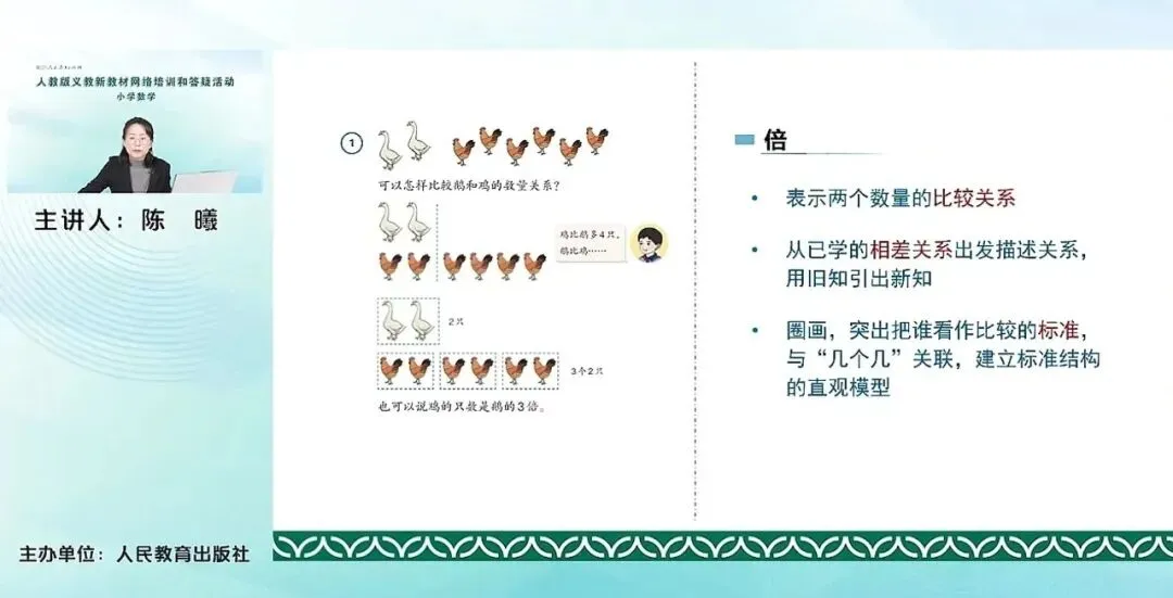 倍可以用来表示两个数量的比较的关系。这里与我们上一版教材相比,它的这个编排上有了一些变化。主要是从学生已经学过的相差关系进行出发,来描述关系,通过旧知来引出新知。这里给出了一个关键性的问题。可以怎样比较鹅和鸡的数量关系?学生如果没有,他没有学过这个倍的概念,他很自然的会想到,鸡比鹅多几只,鹅比鸡少几只,这类表达方式。紧接着,教材通过对比给出来一种,先圈画,然后把它作为一个标准进行比较,去看有几个这样的标准,进行一个几个几的这种关联,建立标准结构的直观模型,最后给出来这个倍的概念。可以看到从旧知引出新知,能够帮助学生进一步感受到倍的这种变化,倍的关键其实是要去找标准。找出这个圈画的这个量是几个,然后去圈,看有几个这样的标准,就是几倍。